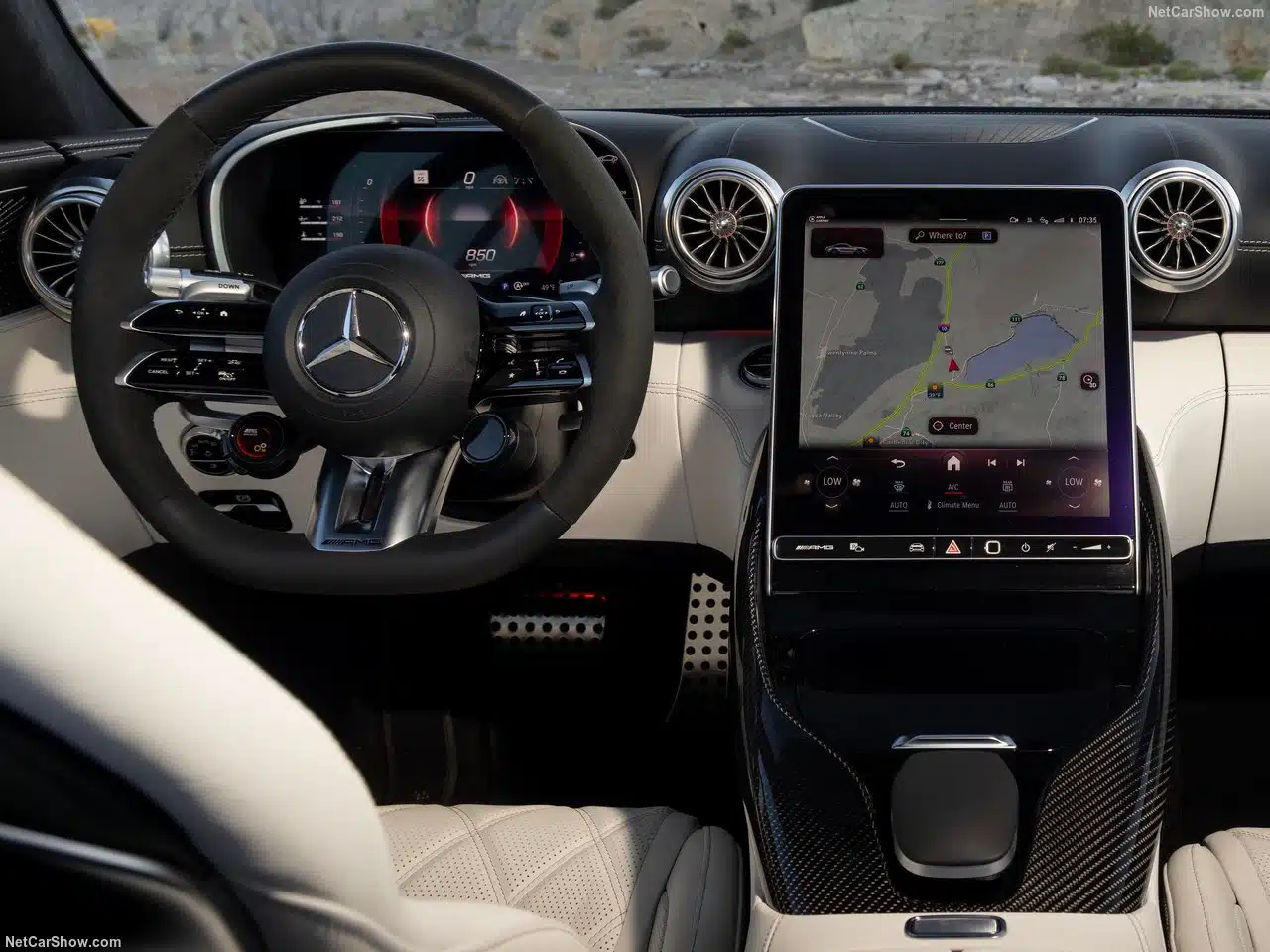 فضای داخلی بنز AMG GT 63 دارای مواد ظریف و دست سازی است که تجربه بصری فوق العاده زیبا و راحتی را برای شما ایجاد می کند. اگرکه از صندلی های اختیاری استفاده نکنید، پشتی صندلی های عقب می توانند تا شوند تا حداکثر 23.8 فوت مکعب فضای بیشتری را برای شما فراهم کنند.