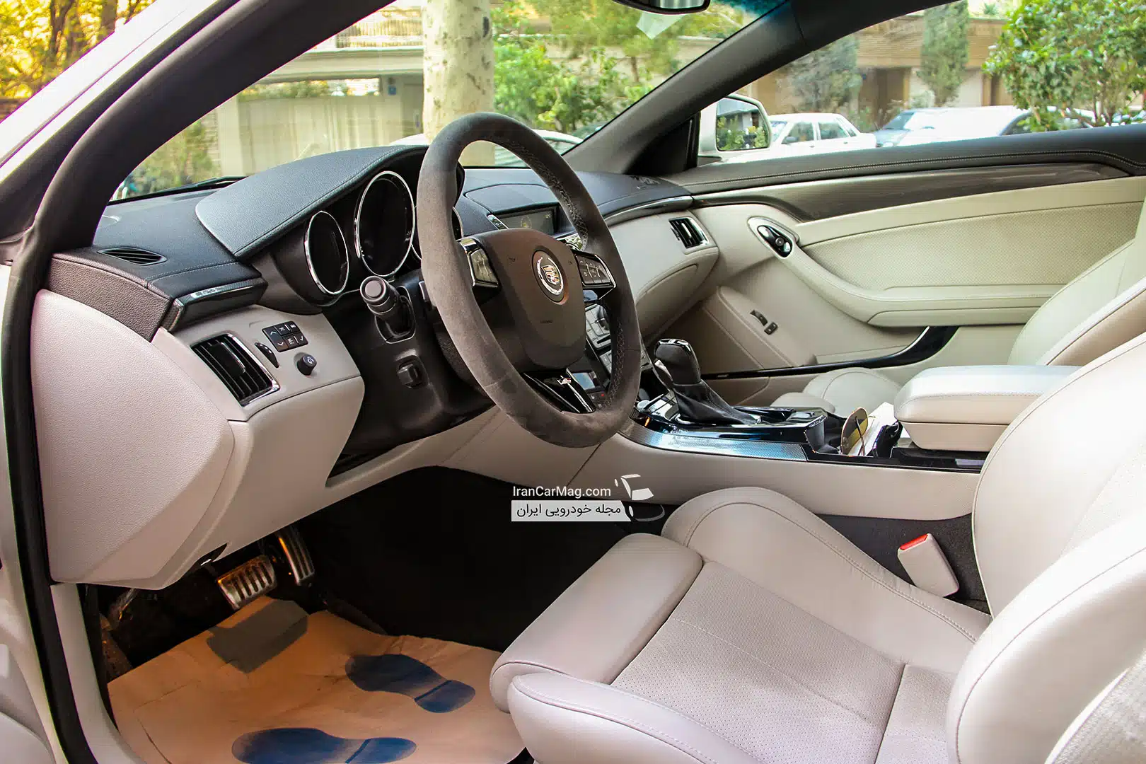 غربلیک فرمان با ظاهر اسپرت و بخشی از اهرم دنده توسط جیر پوشانده شده است. استفاده از جنس جیر همانند چرم های طبیعی و مرغوب باعث می شود تا چسبندگی خوبی بین دست و فرمان ایجاد شود. کادیلاک CTS-V کوپه مورد آزمایش مجهز به جعبه دنده ۶سرعته اتوماتیک با پدال های پشت فرمان ( البته ابعاد بسیار کوچک پدال های تعویض دنده کار کردن با آنها را بسیار دشوار و سخت کرده است، پیشنهاد می کنم برای تعویض دنده در حالت اسپرت از روی اهرم دنده استفاده نمایید.) است.حرکت را آغاز می کنیم.