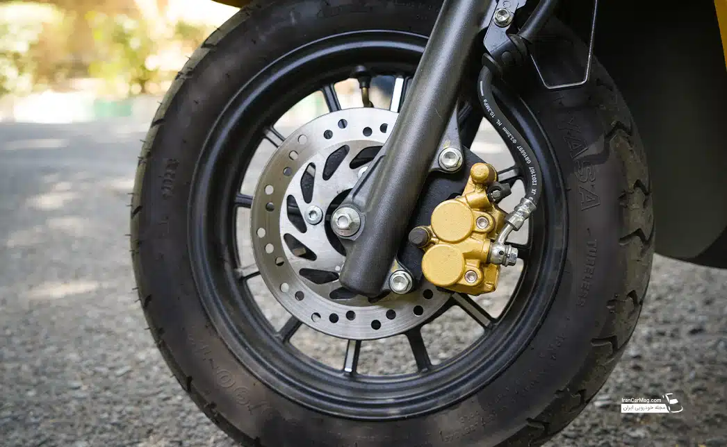 در این اسکوتور خبری از ترمزهای ABS نیست و چرخ 12 اینج جلو دیسکی و چرخ عقب به صورت کاسه ای است.