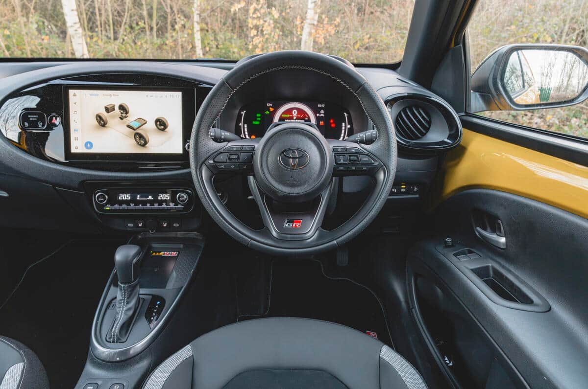 با این حال، فاصله محوری کوتاه و فنرهای بلندتر در پیچ‌های تند و برقراری تعادل آسان، آن را از یاریس هیبرید عقب می‌اندازند. حتی در نسخه GR اسپورت با تعلیق سفت‌تر، جذابیت رانندگی مداوم به پای یاریس نمی‌رسد. کمی شناوری نیز محسوس است.