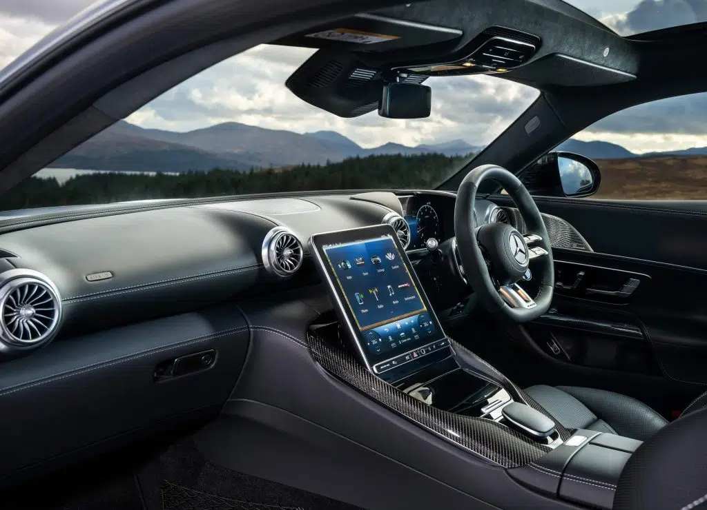 مرسدس AMG GT 63 کوپه جدید به جدیدترین نسلMBUX مجهز شده است که از طریق یک صفحهنمایش لمسی 11.9 اینچی با فرمت عمودی و محتوای گسترده AMG قابل استفاده است. برای مثال، در منوی AMG Performance، راننده میتواند تنها با لمس انگشت خود به مجموعهای از دادهها دسترسی داشته باشد، از جمله کنترل میزان قدرت، گشتاور، شتاب جانبی، توزیع نیرو در سیستم چهارچرخ متحرک و وضعیت فعلی خودرو.