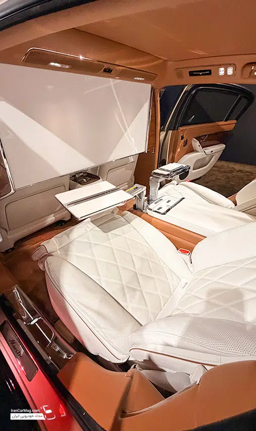 فضای ردیف عقب سرنشینان، صندلی های VIP و پرده 40 اینچی در کنار میز تاشو لپ تاپ