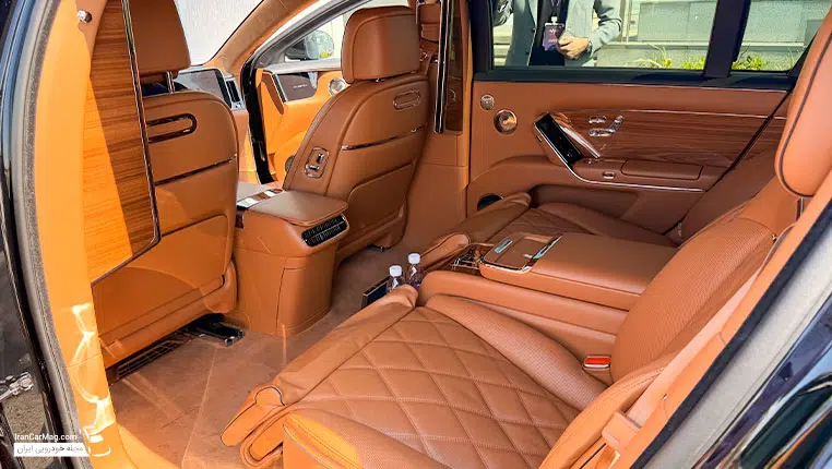 فضای قسمت عقب دارای میز لب تاب، Safe Box، کاپ هولدر با قابلیت گرم و سرد، یخچال با قابلیت تنظیم دما از منفی6 تا مثبت 10 درجه و تنظیم دما در حالت گرم از 35 تا 50 درجه (در داخل یخچال نیز محفظه ای مجهز به سیستم استریل UV برای قرار دادن وسایل شخصی)، آینه آرایش، پرده ی برقی جانبی و عقب، شیشه های دوجداره ضد نویز، سقف کهکشانی، تبلت برای کنترل سیستم صوتی و دیگر امکانات داخل کابین و شارژر وایرلس می باشد.
