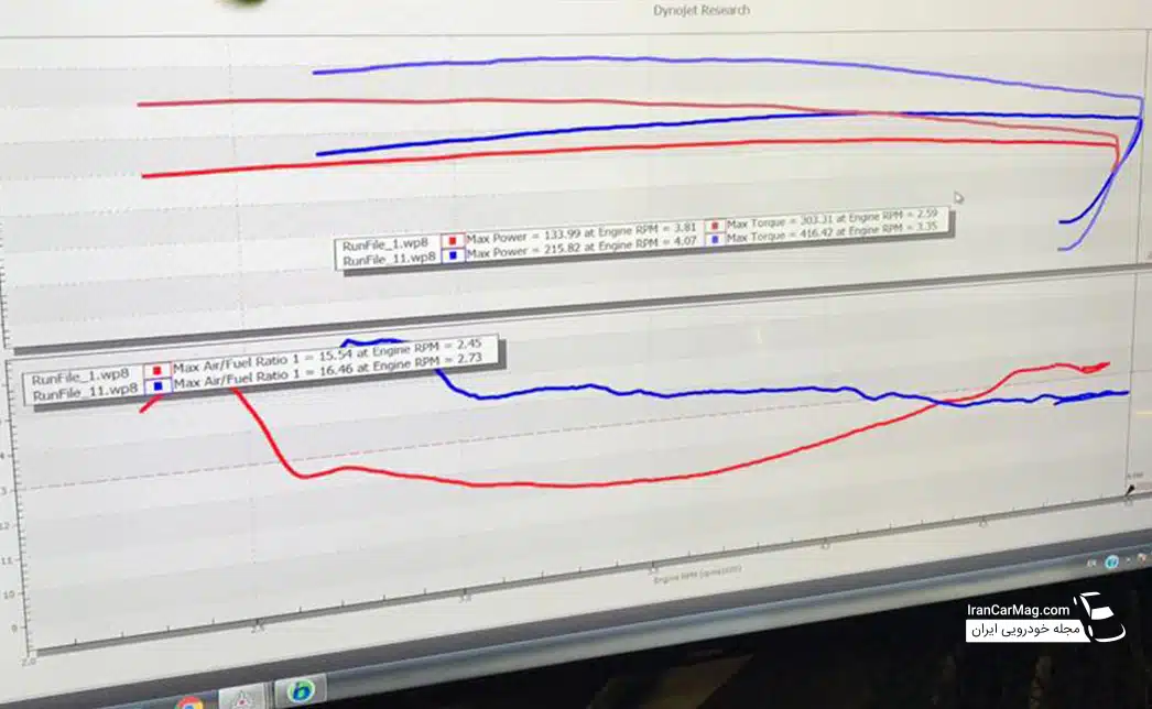 نتیجه دستگاه داینو و اعداد ثبت شده برای گشتاور و اسب بخار خودرو