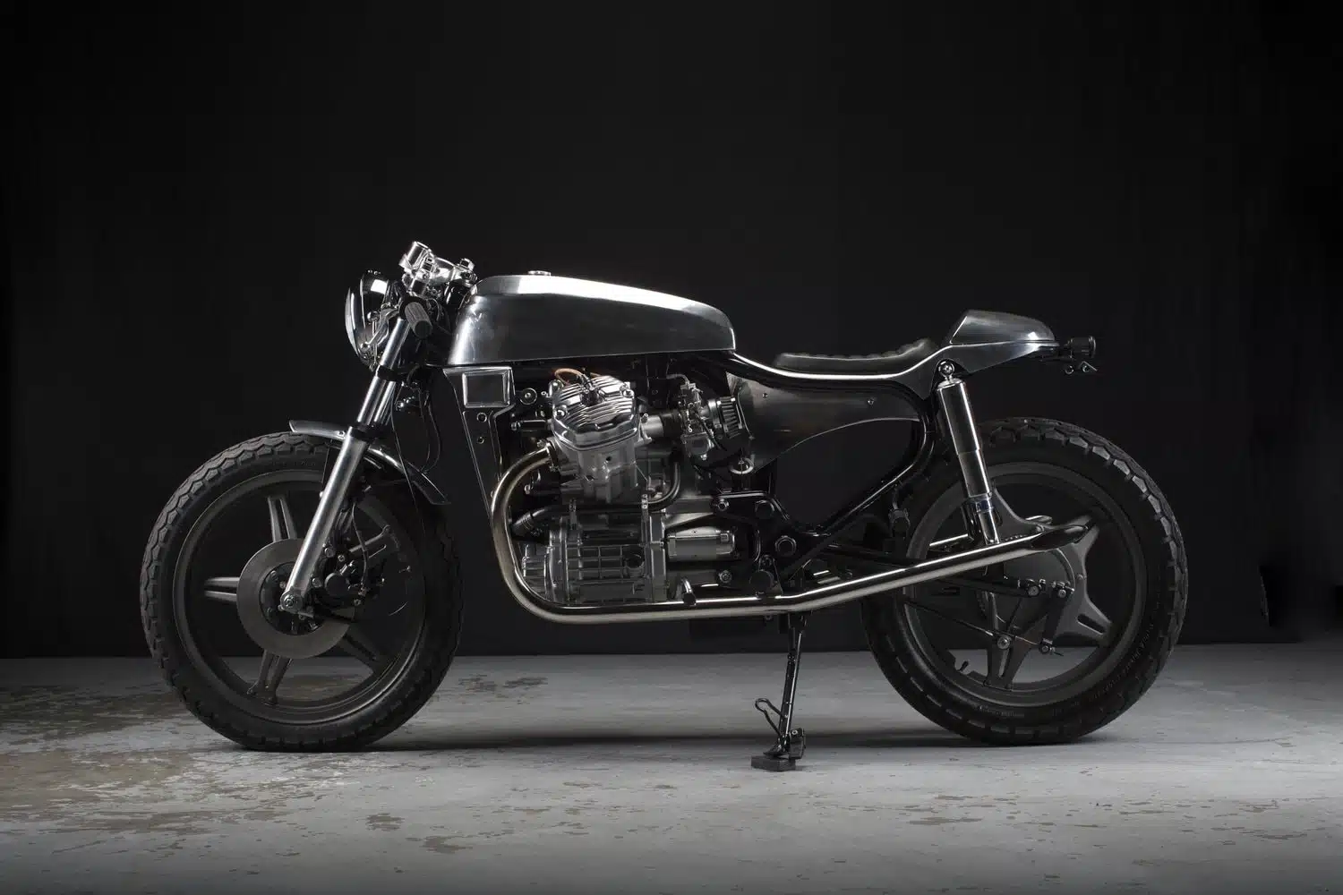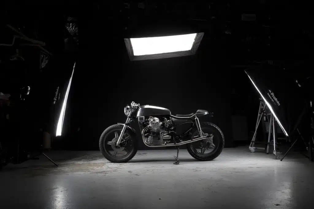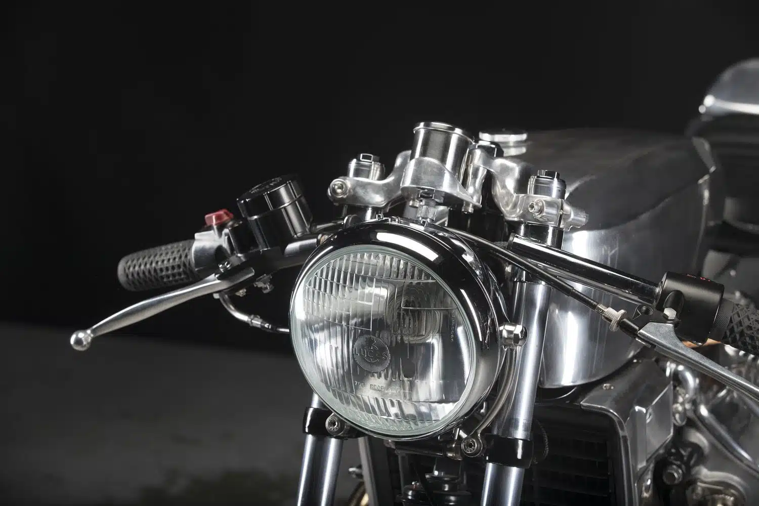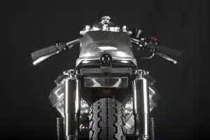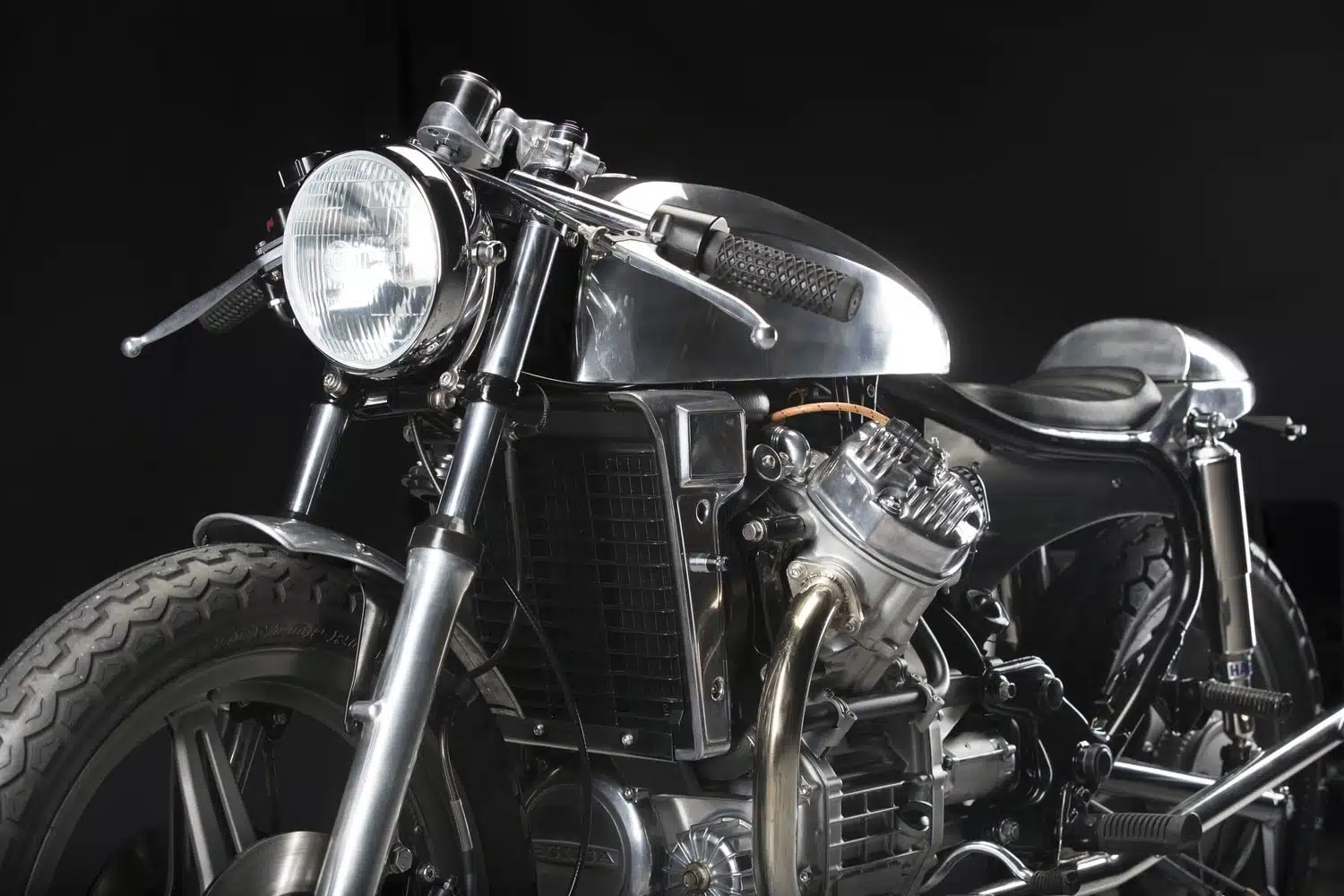در جلوی Honda CX500 Cafe Racer، با یک مخزن سوخت آلومینیومی درخشان مواجه می شویم که از به صورت کاملا دست ساز بازتولید شده است، همراه با نسخه های بازسازی شده روکش های رادیاتور استوک. آخرین قطعه بدنه سفارشی که در اینجا قابل مشاهده می باشد ک گلگیر جلوی سفارشی است که کوچک و باریک است اما کاملاً محکم و با دوام خواهد بود. سیستم نورپردازی قسمت جلویی از یک چراغ جلوی تریومف بهرهمند شده است که از طریق براکتهای سفارشی در جای خود قرار گرفته است.