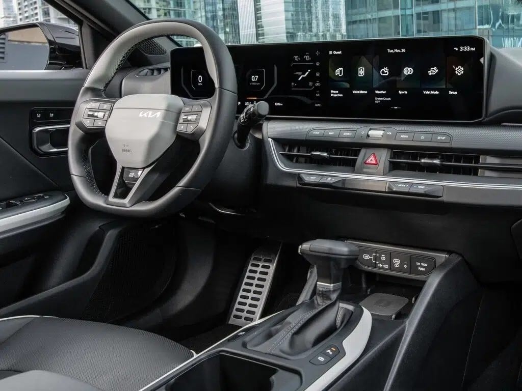 داخل کابین کیا K4 هم با رنگهای خاکستری متوسط (LX/LXS/EX) یا سبز تیره (EX) طراحی شده، درحالیکه مدلهای GT-Line ترکیب Onyx و Off-White رو دارن. صندلیهای جلوی گرمشونده توی مدل GT-Line و بالاتر بهصورت استاندارد ارائه شده، و صندلیهای دارای تهویه و حافظه صندلی راننده هم بهصورت آپشنال در دسترس هستن. مدلهای GT-Line همچنین به فرمان سهپره اسپرت مجهز شدن.