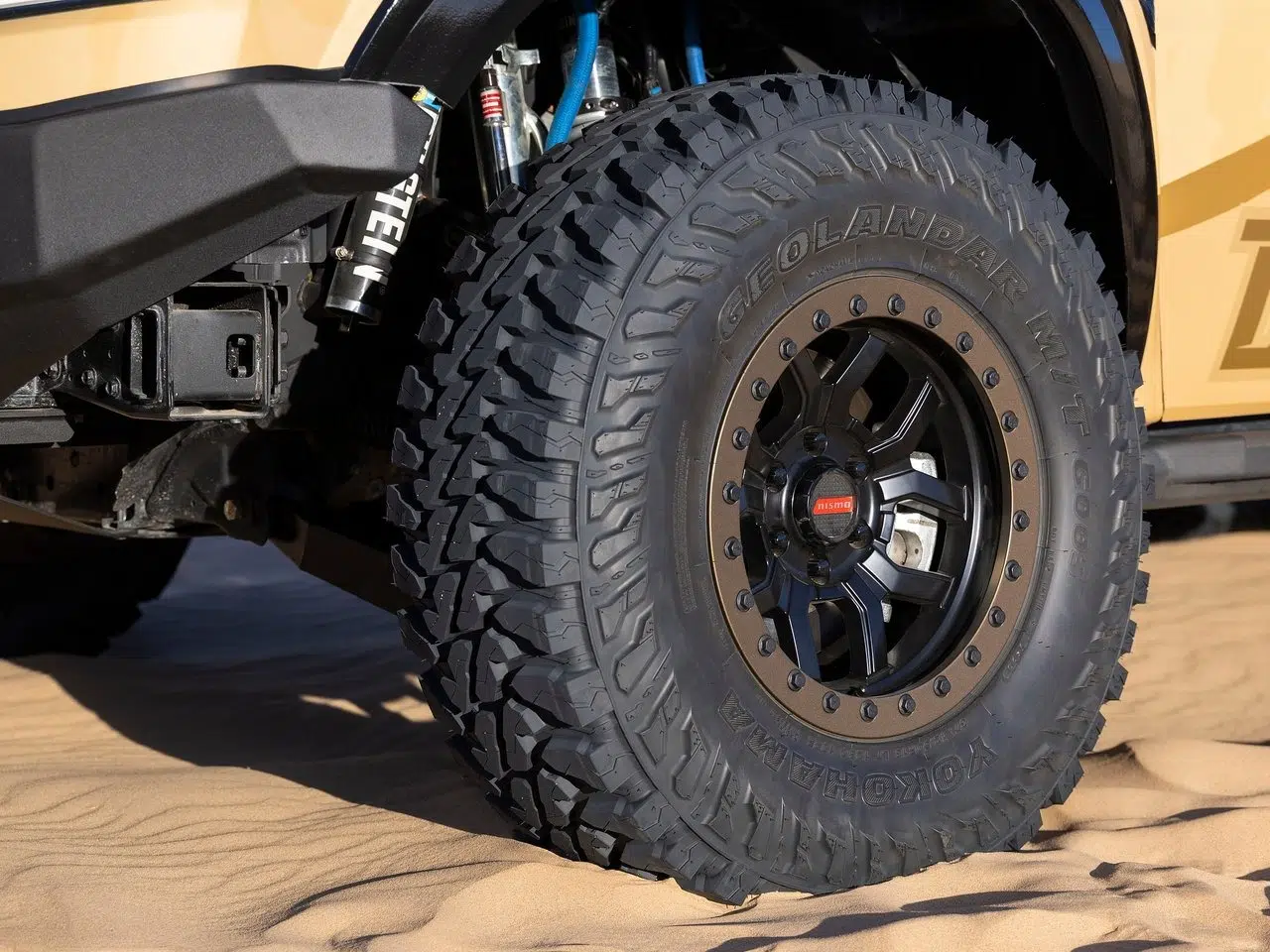 شروع کار با چرخهای NISMO Off Road AXIS از نوع Beadlock و تایرهای غولپیکر Yokohama Geolander MT سایز 37 اینچ است. سیستم تعلیق با فنرهای 10 اینچی و کمکفنرهای Bilstein M9200 Bypass در جلو و عقب تنظیم شده تا بیشترین دامنه حرکت ممکن را فراهم کند.