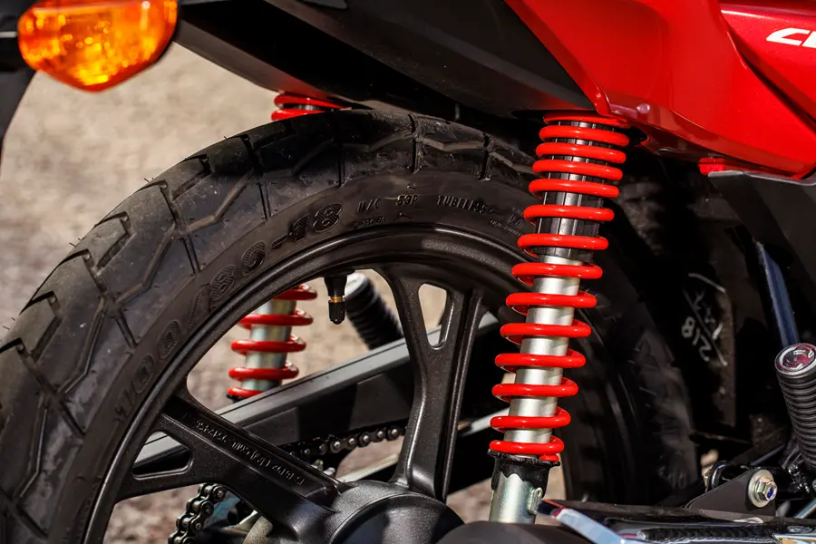تعلیق جلو با فورک ۳۱ میلیمتری و کمکهای دوگانهٔ عقب، کار خود را انجام میدهند، اما با افزایش سرعت در جادههای روستایی یا برخورد با چالههای شدید، کمی ناپایدار میشوند. اگر عملکرد بیشتری میخواهید، بهتر است نگاهی به CB125R بیندازید که فورکهای ۴۱ میلیمتری USD و یک کمکفنر عقب تکگانه ارائه میدهد.