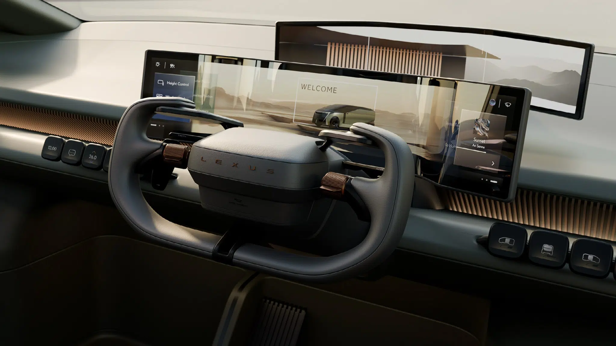 چراغهای جلو ظاهری تهاجمی و تیغهمانند دارند و جلوپنجره بزرگ با خطوط عمودی بارز، یادآور طراحی دوکیشکل کلاسیک لکسوس است. سقف تخت و شیشههای پانورامای تمامقد، نمایی مینیمال و آیندهنگر ایجاد کردهاند. چرخهای اضافی عقب — که غیرمعمولترین بخش این طرح است — نه تنها به زیبایی بصری کمک میکنند، بلکه تعادل و فضای داخلی بیشتری برای مسافران فراهم میکنند.
